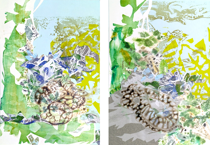 [Collage incl. Funori Screenprint with Matcha and Acrylics, Walnut Ink on Duralar, and Gouache on Cut, Toned Paper. ] each 6.25” x 9”